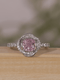 - Beautiful cushion-cut pink centre stone with sparkling halo detailing